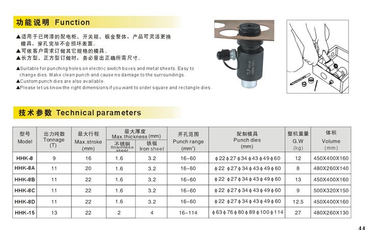Máy đột lỗ tôn thủy lực HHK-15 là sản phẩm chuyên dùng để đột lỗ ( gia công lỗ) trên những vật liệu mỏng như tôn, thép mềm, inox tấm. ( Với thép không rỉ bề dày không quá 2 mm, với sắt tấm bề dày không quá 4 mm)